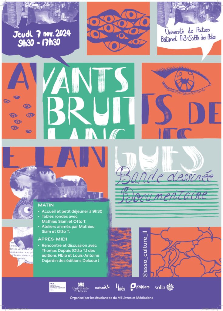 J’ai participé à cet événement en tant qu’étudiante du Master 1 Limés. Je faisais partie de l’équipe graphisme qui était chargée de la réalisation de l’affiche et des flyers. Ma participation a donc surtout eu lieu en amont de l’événement. Lors de la journée en question, j’ai aidé les autres équipes lorsqu’il y avait besoin avec notamment l’installation des chaises. A part cela, la journée était calme et demandait peu d’investissement de notre part, j’ai donc assisté aux rencontres avec les auteurs et l’éditeur de chez Delcourt ainsi qu’à l’atelier d’Otto T (auteur) qui étaient fort intéressants. Cette journée, qui est un avant-goût de Bruits de Langues en mars, m’a déjà permis d’avoir un aperçu de ce que demande l’organisation d’un festival universitaire, même sur une journée, ce qui a été une riche expérience qui se poursuivra jusqu’à Bruits de Langues.